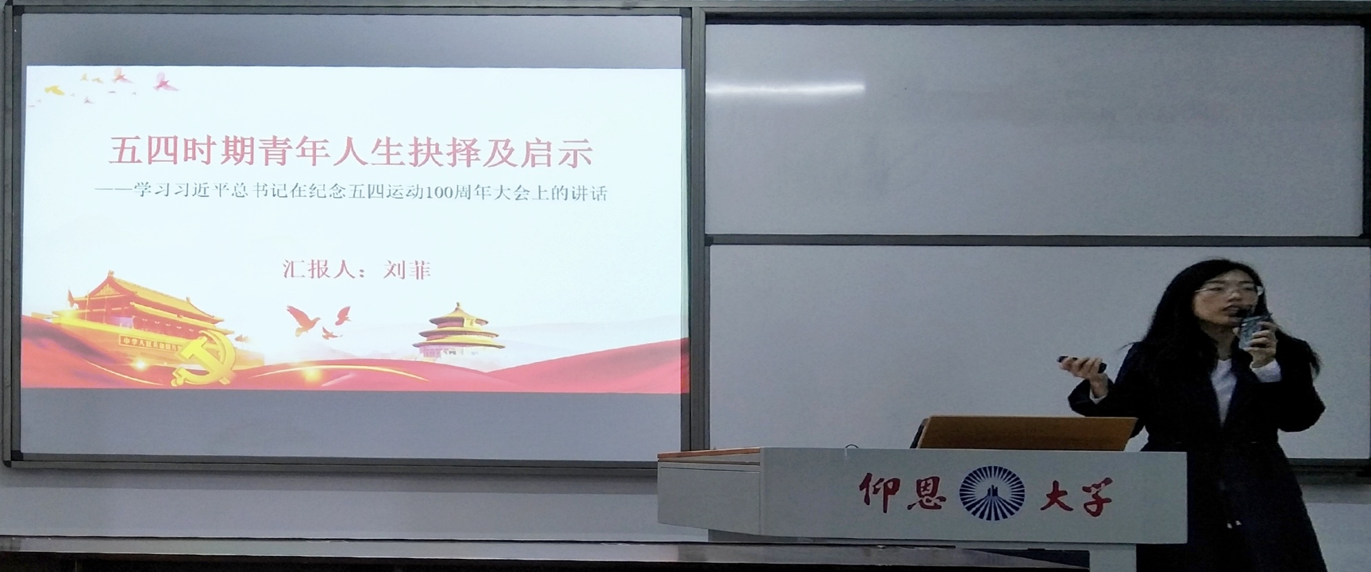 5月8日下午,习近平新时代中国特色社会主义思想读书社在普照楼311开展了本学期第一次学习活动。思政部教师刘菲做了题为《五四时期青年人生抉择及启示——学习习近平总书记在纪念五四运动100周年大会上的讲话》的专题讲座,习近平新时代中国特色社会主义思想读书社全体社员参加了此次活动。