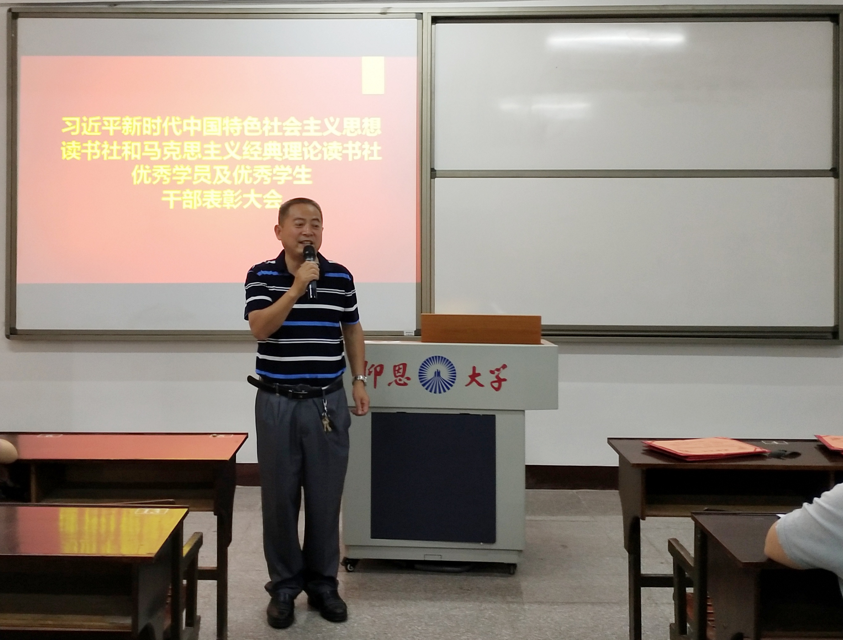 习近平新时代中国特色社会主义思想读书社指导教师高灿宣读表彰文件,此次表彰大会表彰了习近平新时代中国特色社会主义思想读书社和马克思主义经典理论读书社两个读书社的优秀学员及优秀学生干部。结合社员学期表现、报告撰写情况及教师评价,两个读书社共表彰了26位优秀学员和6位优秀学生干部。马克思主义经典理论读书社社长、优秀学生干部欧敏敏代表发言,她以亲身的经历向在座的师生讲述了自己参加读书社前后思想及心理上的成长及蜕变。