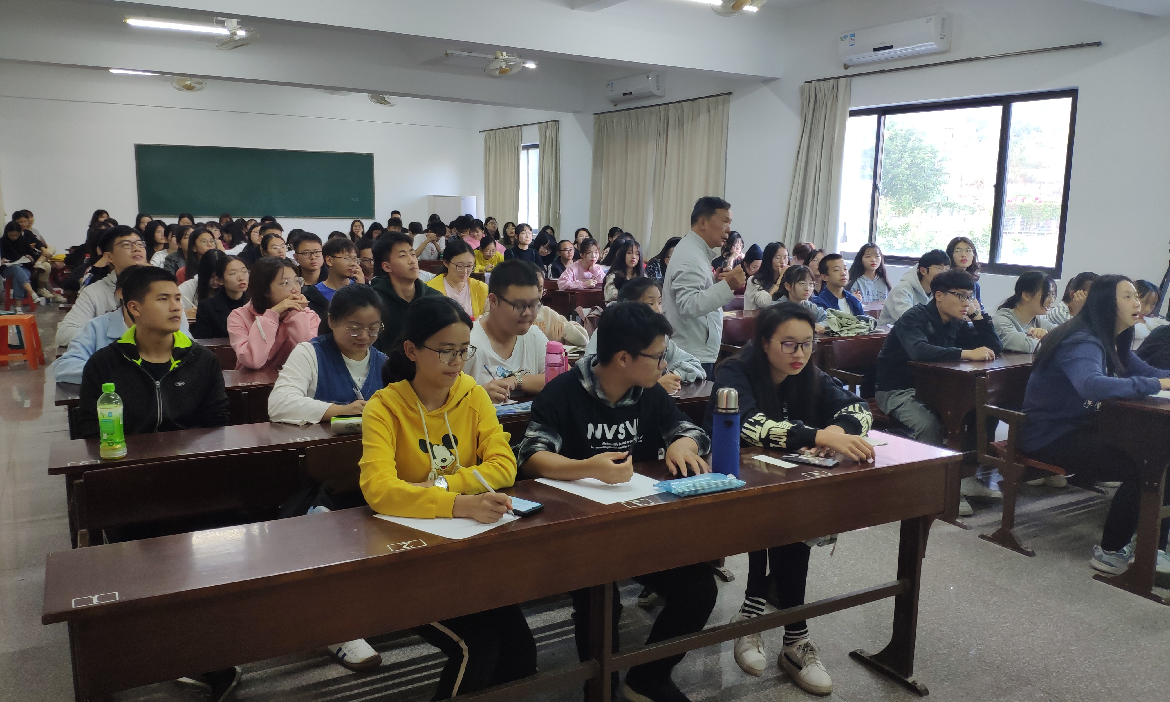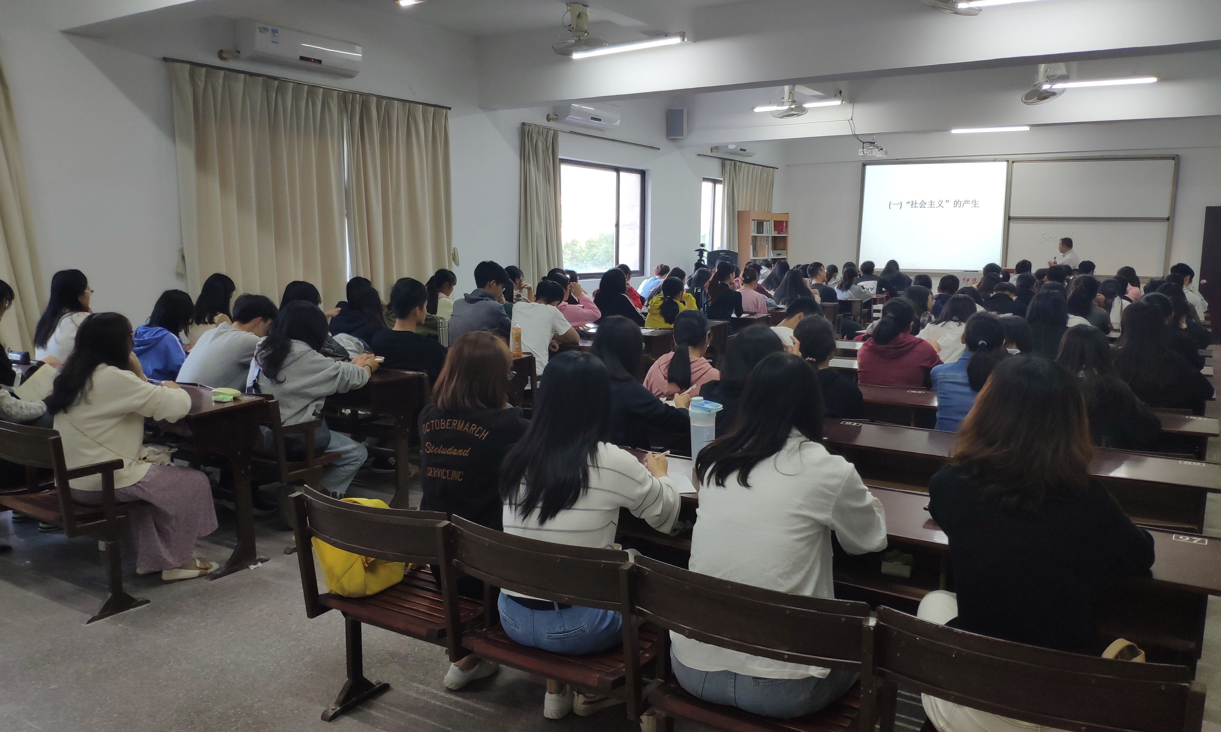 林文景老师从社会主义的产生、定义及演变过程出发,着重讲解了社会主义的特征:人民当家作主、按劳分配和生产资料公有制。同学们聚精会神,认真聆听林老师的讲述,林老师用简单的例子使同学们对马克思主义社会主义观的了解更加深刻。