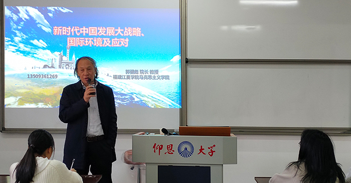 12月4日下午,福建江夏学院pp电子游戏官网院长郭健彪教授受邀在普照楼311教室作了题为《新时代中国发展大战略、国际环境及应对》专题讲座。pp电子游戏官网直属党支部书记、常务副院长李克钦主持此次讲座,pp电子游戏官网全体教师及习近平新时代中国特色的社会主义思想读书社习思想读书社全体成员百余人聆听了此次讲座。