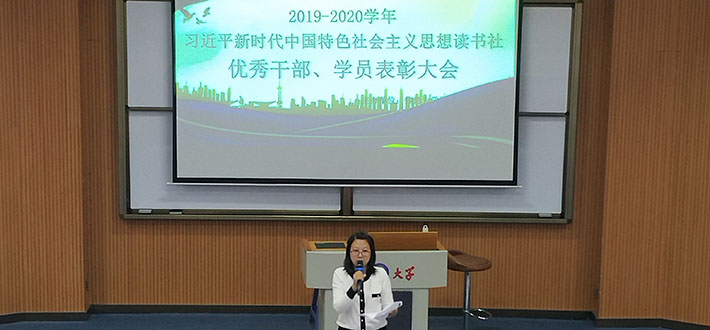 表彰大会按照既定议程,首先由党委组织部部长王洋宣读《2019-2020学年习近平新时代中国特色社会主义思想读书社表彰决定》,对读书社8名优秀学生干部和26名优秀学员予以表彰。党委副书记程如平、组织部部长王洋和宣传部副部长陈章祧分别为“优秀学生干部”和“优秀学员”颁奖并合影留念。