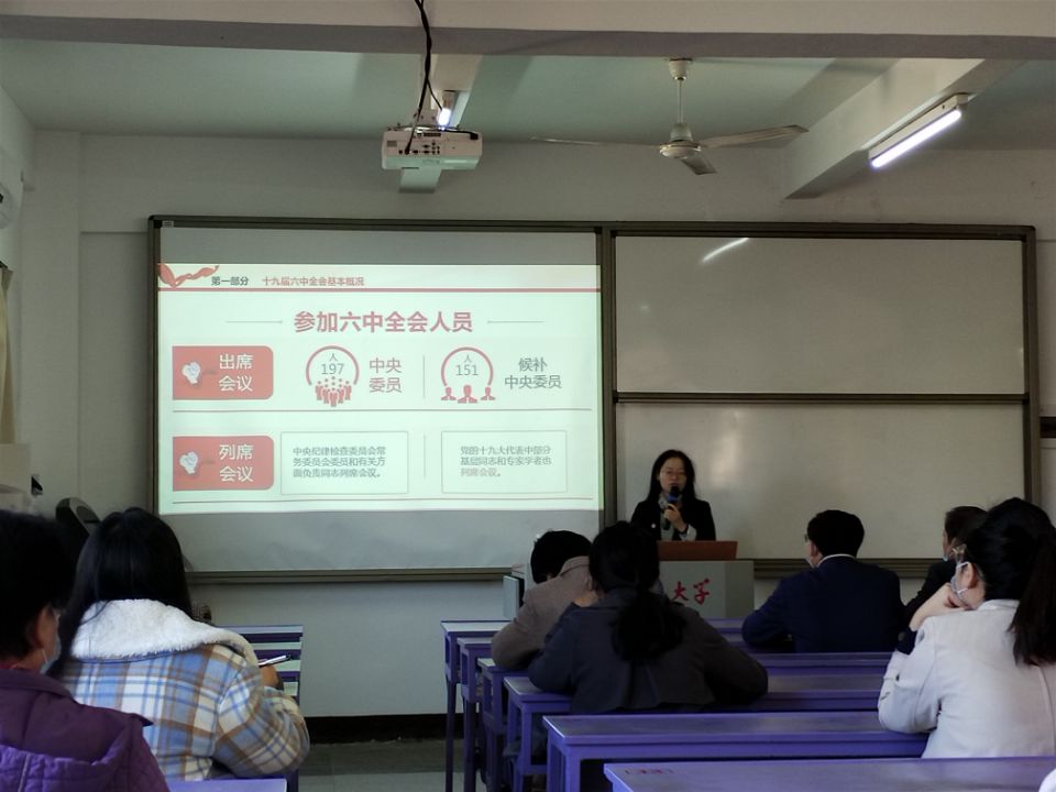 12月9日上午,机关党总支、图书馆直属党支部、pp电子游戏官网直属党支部在第一教学区吉龙楼401室联合开展党的十九届六中全会精神宣讲会,pp电子游戏官网副教授孙海英作《学习贯彻党的十九届六中全会精神》辅导报告,三个部门全体教职工一同聆听了宣讲。