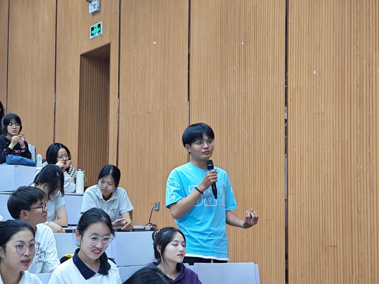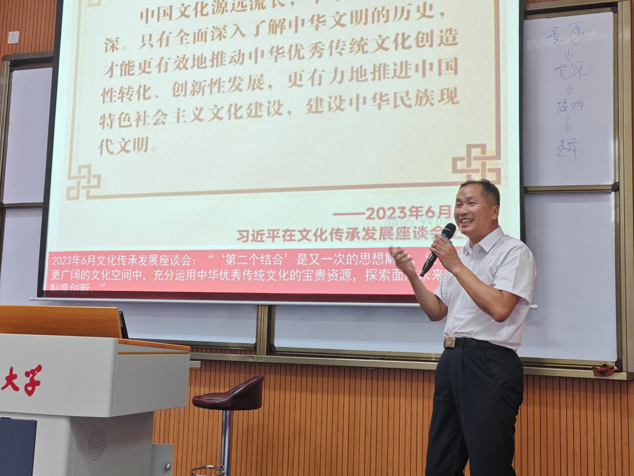 肖教授精心梳理了二十大报告的重要观点,用幽默风趣的话语向同学们呈现了报告的精神内核。当讲到习近平思想与传统文化的关系时,肖教授采用古今对比的方式,让同学们直观感受到习近平文化思想与传统文化的共通性,让同学们更深刻地认识到习近平文化思想是对中华优秀传统文化的创造性转化与创新性发展的最新成果,讲座以同学们热烈的掌声结束。