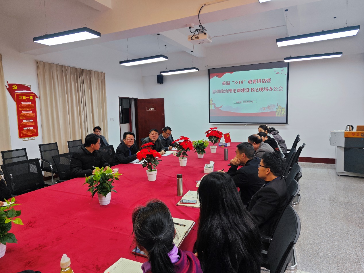 3月18日下午,“仰恩大学重温习近平总书记‘3·18’重要讲话暨思想政治理论课建设书记现场办公会”在普照楼316会议室举行,校党委书记何宏舟,党委办公室、党委宣传部、党委学生工作部等有关部门负责人以及pp电子游戏官网全体教师参会。会议由党委宣传部负责人陈章祧主持。