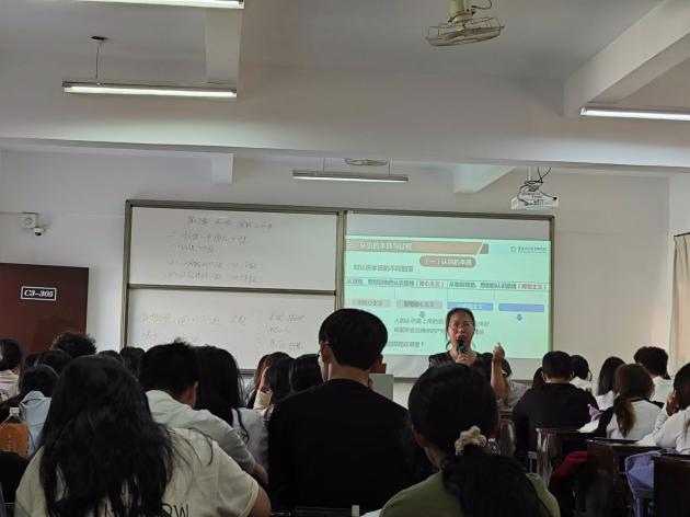 10月29日,我院马克思主义原理课教研组副教授杨丽娥老师的示范观摩课在仰C3-305举行,杨老师从理论的高度与深度向同学们讲解“认识的本质与过程”,以贴近学生生活实际的例子分析了认识的第一次飞跃与认识的第二次飞跃,深入分析改造主客观世界的重要意义,落脚于大学生精神境界的提升与人自身的改造,充分体现了思政课以理服人、立德树人的课程特点。杨丽娥老师充分注重对学生的思维引导,循循善诱,不断启发、提示学生探究正确答案,对重难点的讲解清晰、透彻,课堂教学节奏张弛有度,坚持实现“八个相统一”,为全体教师深化课堂理论引领、教学话语转化提供了有益借鉴。