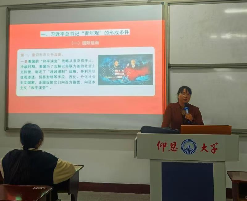 讲座伊始,章娇娜从国际和国内两个方面阐述了习近平总书记“青年观”的形成条件,引导学生认识到习近平总书记的“青年观”是在统筹中华民族伟大复兴战略全局和世界百年未有之大变局“两个大局”的时代背景下形成的。随后,章娇娜从青年是实现中国梦的先锋力量、青年要高举理想信念旗帜等几个方面系统介绍了习近平总书记的“青年观”。最后,从价值维度引导学生思考习近平总书记“青年观”的理论与现实意义。