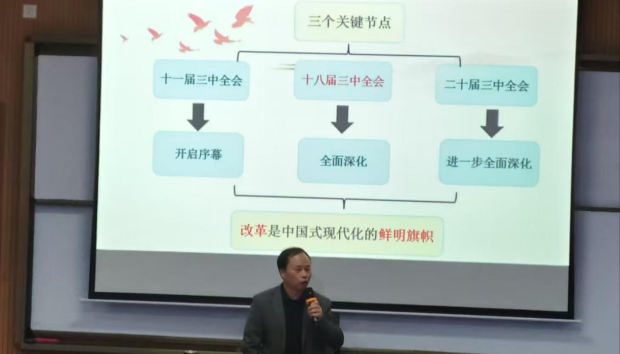 曹文宏教授系统地梳理了党的历次全会所聚焦的重点议题,并着重指出了二十届三中全会的重大意义。他从三个方面进行了深入剖析:首先,阐述了为何二十届三中全会被视为改革的实践续篇;其次,认为它是现代化的实践新篇;最后,探讨了如何以改革推进中国式现代化。曹教授通过引用大量详实的数据,全方位地展示了二十届三中全会的改革成就。同时,他还通过分析中美关系,引出了当前中国式现代化面临的重要议题,并对此进行了深入的总结。在讲座中,曹文宏教授引经据典、旁征博引,展现出高屋建瓴的学术视野,为在场的教师和学生提供了一场深刻且内容丰富的理论学习盛宴。
