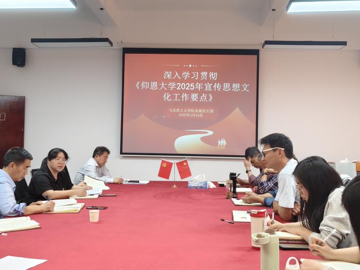 章娇娜带领大家一起学习了《仰恩大学2025年宣传思想文化工作要点》。章娇娜围绕“工作要点”的六部分内容即“坚持思想理论‘铸魂’,持续深化理论武装;坚持政治安全‘夯基’,持续加强意识形态安全;坚持思政教育‘引领’,持续抓好时代新人培育;坚持文化提升‘润心’,持续强化文化传承创新;坚持主流舆论‘强音’,持续构建‘大宣传’格局;坚持队伍建设‘赋能’,持续增强守正创新能力”,结合学院实际,对如何贯彻落实“工作要点”精神进行了思想动员,提出了具体工作要求,做出了相关工作安排和部署。